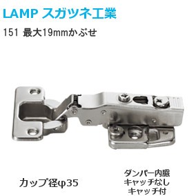 スガツネ工業/ランプ 151 スライド丁番 最大19mmかぶせ カップ径φ35 105°開き【ダンパー内蔵/キャッチなし/キャッチ付】座金・ビス付