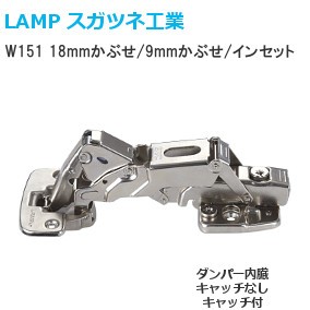 スガツネ工業/ランプ W151 広角度スライド丁番 最大18mmかぶせ/9mmかぶせ/インセット カップ径φ35 最大150°開き【ダンパー内蔵/キャッチなし/キャッチ付】座金・ビスセット