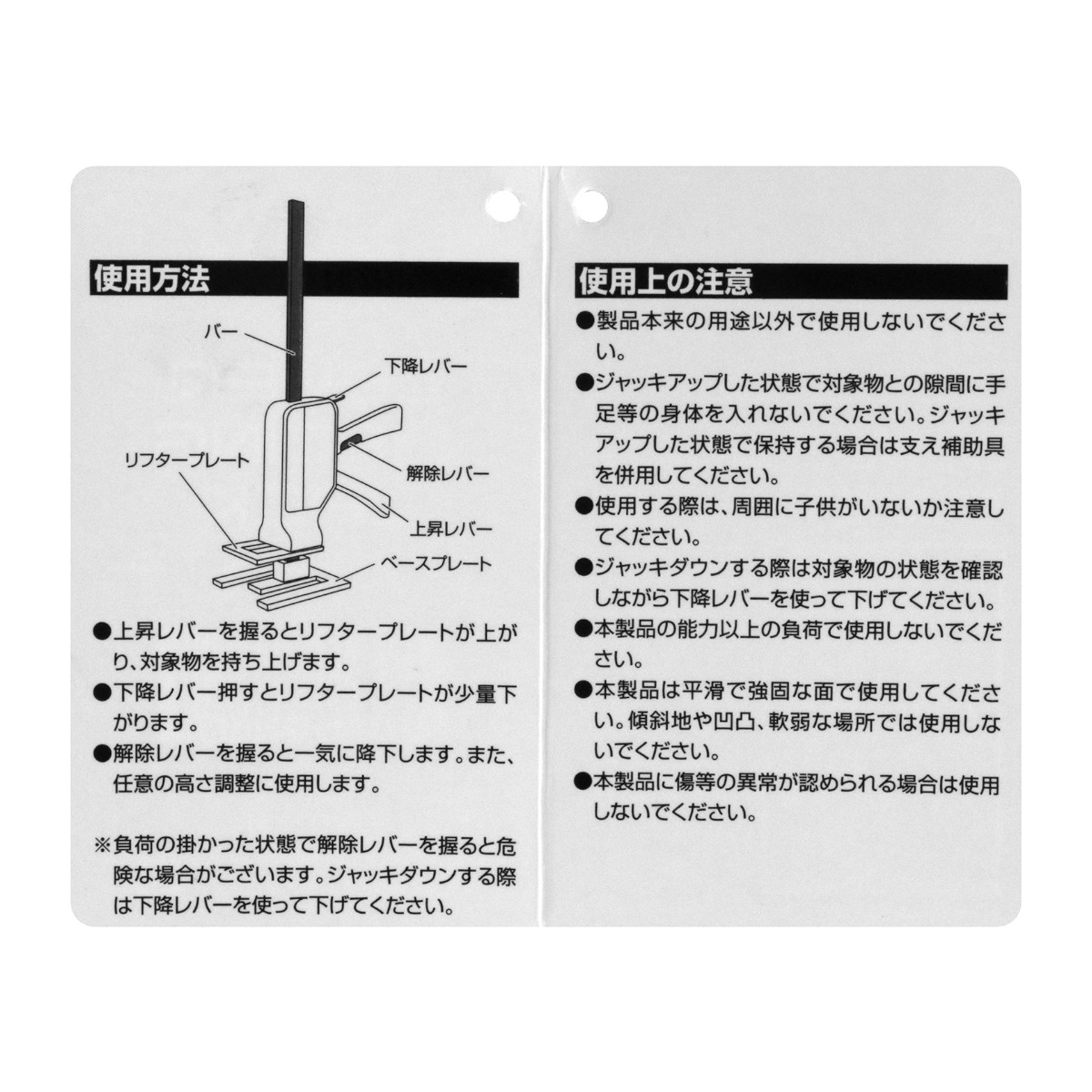| 使用方法 | ・上昇レバーを握るとリフタープレートが上がり、対象物を持ち上げます。 ・下降レバーを押すとリフタープレートが少量下がります。 ・解除レバーを握ると一気に降下します。また、任意の高さ調整に使用します。 |