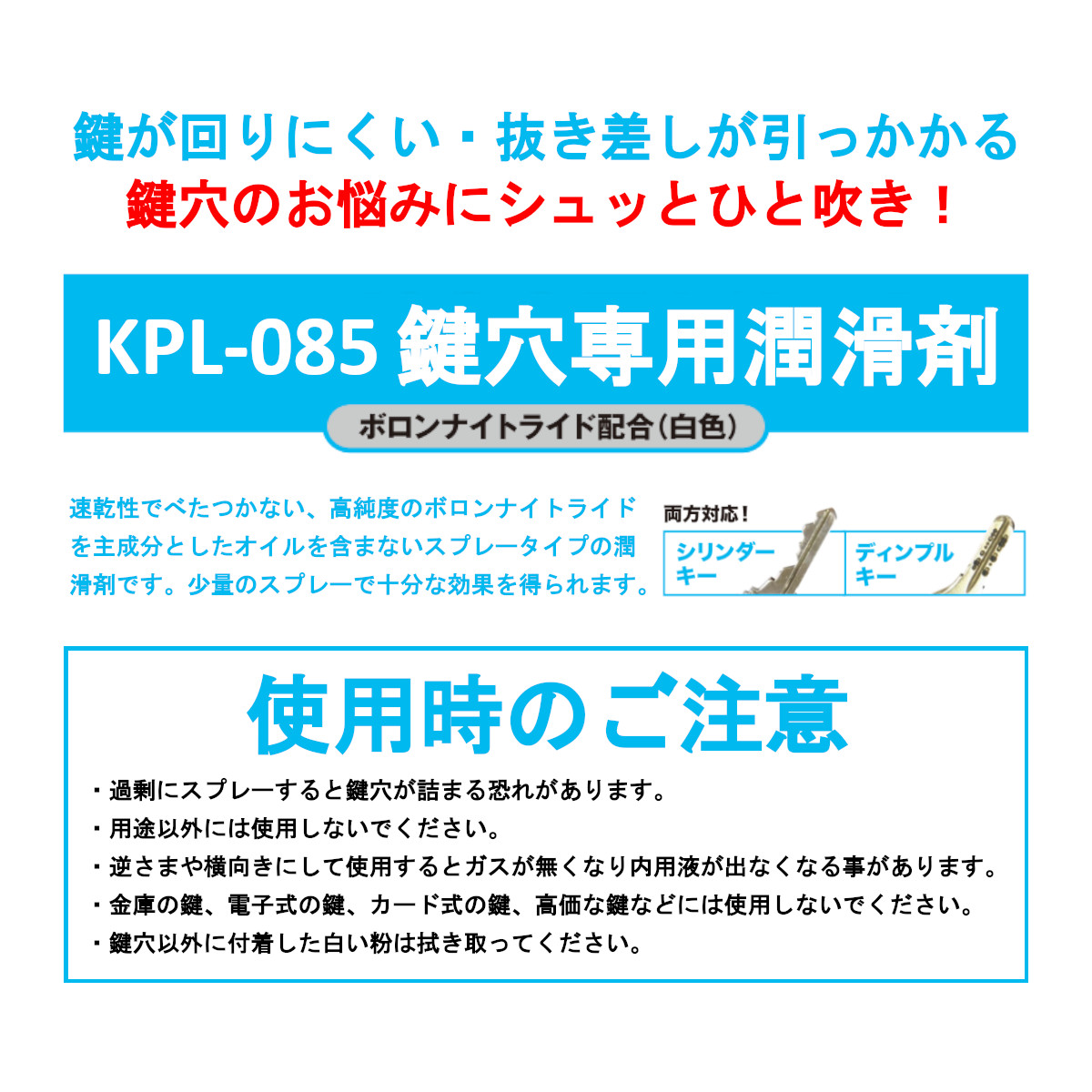 | ご注意 | ・過剰にスプレーすると鍵穴が詰まる恐れがあります。 ・用途以外には使用しないでください。 ・逆さまや横向きにして使用するとガスが無くなり内用液が出なくなる事があります。 ・金庫の鍵、電子式の鍵、カード式の鍵、高価な鍵などには使用しないでください。 ・鍵穴以外に付着した白い粉は拭き取ってください。 |