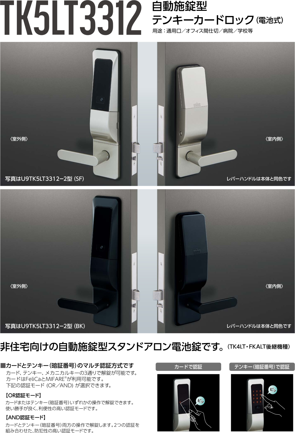 美和ロック TK5L3312-2 自動施錠型テンキーカードロック 電池式 仕上:SF/BK バックセット:51mm/64mm 扉厚可能範囲33mm~41mm
