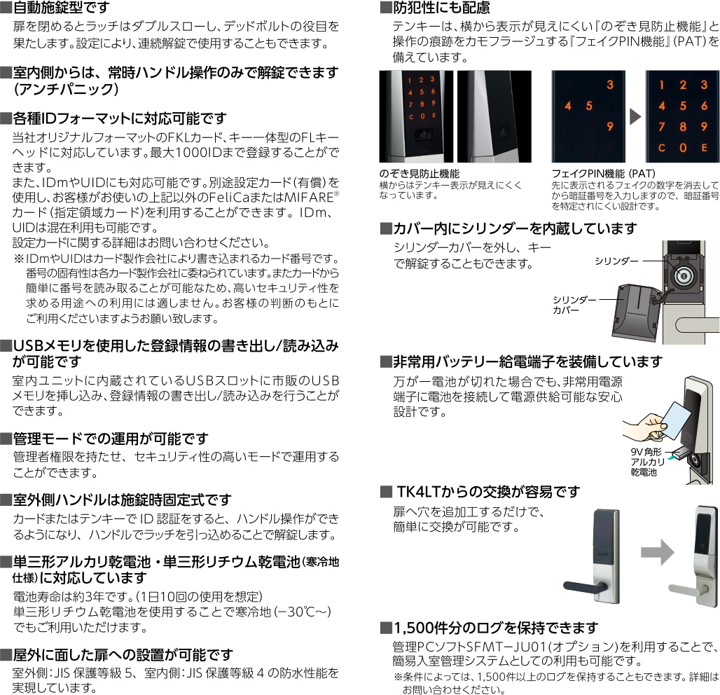 | 認証媒体 | FeliCa:FKLカード、FLキーヘッド、IDm、お客様任意ID MIFARE Standard(Classic):UID(4Byte/7Byte)、お客様任意ID MIFARE Plus:TLNF-C01 |