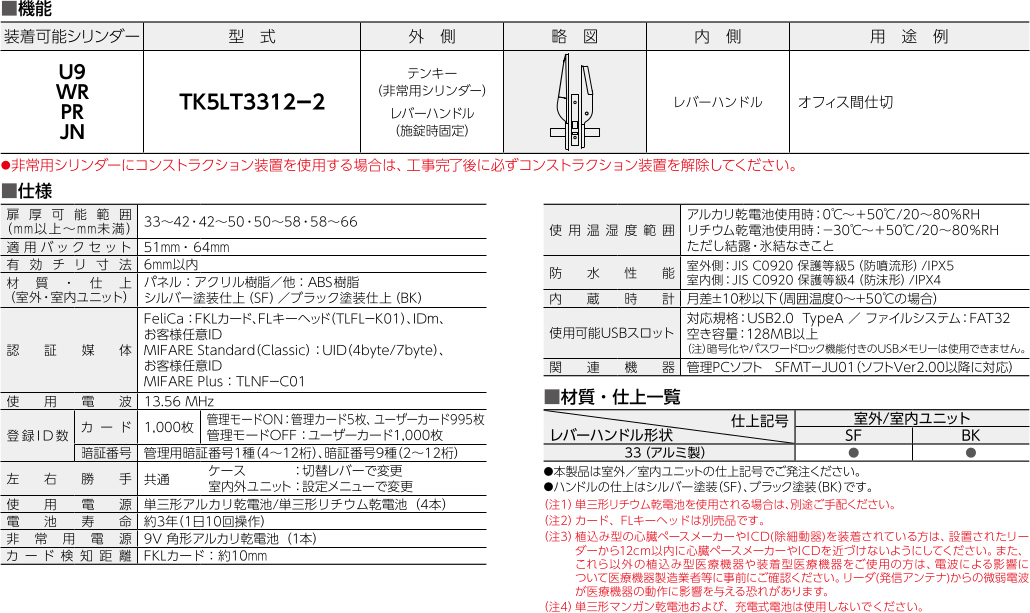| ご注意 | ●単三リチウム乾電池を使用される場合は、別途ご準備ください。 ●カードキー・FLキーヘッドは別売り品です。 ●埋め込み型の心臓ペースメーカーやICDを装着されている方は、設置されたリーダーから12cm以内に心臓ペースメーカーやICDを近づけないようにしてください。また、これら以外の埋め込み型医療機器や装着型医療機器をご使用の方は、電波による影響について医療機器製造業者等に事前にご確認ください。リーダ(発信アンテナ)からの微弱電波が医療機器の動作に影響を与える恐れがあります。 ●単三マンガン乾電池および充電式乾電池は使用しないでください。 ●商品の特性上、ご注文確定後のキャンセル・返品・交換はお受けできません。 |