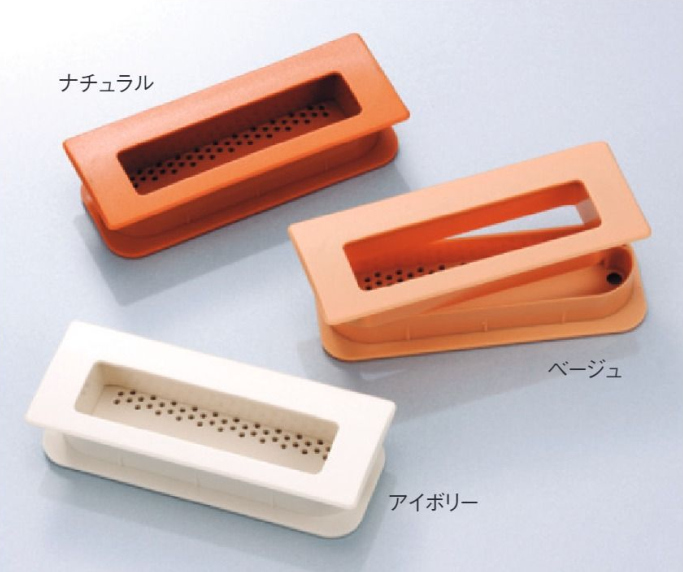 | 特長 | 自然換気孔(空気抜)付きの、挟み込みタイプの引手です。 引手上部には高さ14mm程度のスペースがあり、テプラなどを貼ることができます。 |