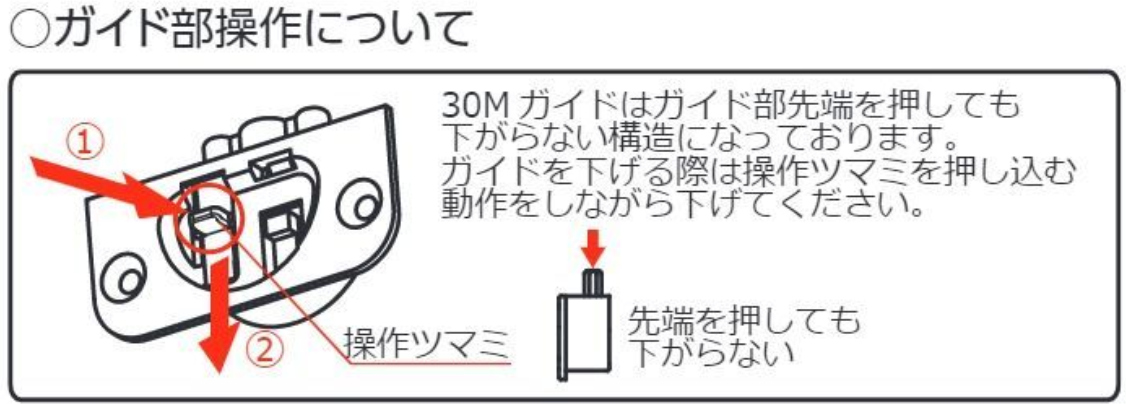 | ガイド操作部について | 30Mガイドは、ガイド部先端を押しても下がらない構造になっております。ガイドを下げる際は操作ツマミを押し込む動作をしながら下げてください。 |